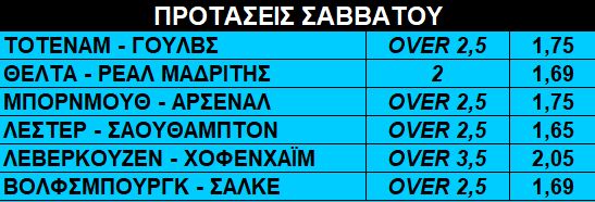 * Στην Πρέμιερ Λιγκ, η Τότεναμ υποδέχεται την Γουλβς. Οι γηπεδούχοι έχουν δύο over 3,5 σε ισάριθμα ματς (4-1 Σαουθάμπτον, 2-2 Τσέλσι), ενώ οι φιλοξενούμενοι μετά την ήττα 2-1 από την Λιντς, έμειναν στο 0-0 με την Φούλαμ. Η Τότεναμ μπορεί να βγάλει το over 2,5 στο 1,75.