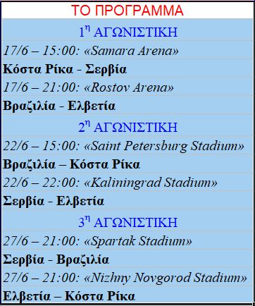 Η Βραζιλία είναι το φαβορί για την πρωτιά στον 5ο όμιλο του Μουντιάλ, ενώ από εκεί και πέρα μεγάλη μάχη αναμένεται να γίνει για τη 2η θέση, με την Ελβετία να δείχνει πιο δεμένη σε σχέση με Σερβία και Κόστα Ρίκα.