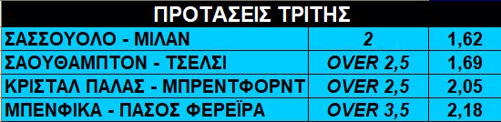 * Στην Πορτογαλία, η Μπενφίκα φιλοξενεί την Πάσος Φερέιρα. Τρεις νίκες σε ισάριθμα ματς για τους γηπεδούχους, με τα δύο στο over, ενώ αντίθετα οι φιλοξενούμενοι μετρούν τρεις ήττες στα πρώτα τρία παιχνίδια τους, με τα δύο στο over. Η Μπενφίκα μπορεί να μας δώσει το over 3,5 στο 2,18.